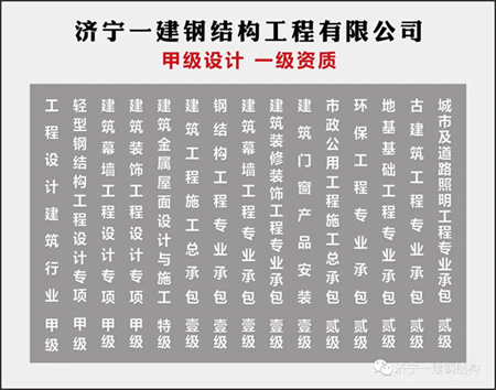 濟寧一建鋼結構工程有限公司,隸屬中煤建設集團,集團注冊資金1.0158億元人民幣,下設工程部、設計部、技術部、質檢部、生產部、安全部。擁有鋼結構施工、設計雙甲資質、制造壹級資質,幕墻施工、設計雙甲資質,裝飾裝修施工、設計雙甲資質,建筑金屬屋面設計與施工特級資質,門窗施工壹級資質,并具有對外承包施工資質和勞務輸出資質等九項國家甲級資質。主要從事鋼結構網架工程、管桁架工程、裝配式輕鋼別墅工程、膜結構工程及大型儲罐工程的設計、生產與施工,公司相繼承攬了機場航站樓、體育場館、省級科技館、大型廠房、高速路服務站、國家石油儲庫、加油站、儲煤倉等各類工程,施工范圍涉及全國三十多個省、市、自治區及直轄市,工程質量合格率100%,多年來榮獲國內建筑界各類獎項100余個。